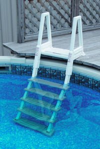 6000B Features: -Ladder. -Flat treads for easier climbing. -Includes deck platform. -No sand required. -Anti-entrapment barrier. -White side rails with grey trends for high visibility. -Deluxe heavy-duty in-pool ladder. Specifications: -Weight guidelines: 300 lbs. -Totally adjustable for deck heights from 46" to 56". -Treads measure 5" x 18" Wide. Weight guideline: 300 lbs. Step Dimensions: 5in. x